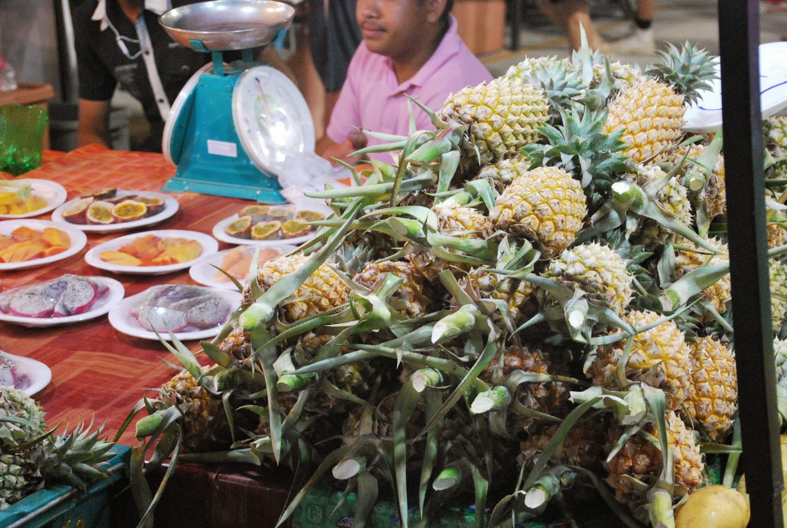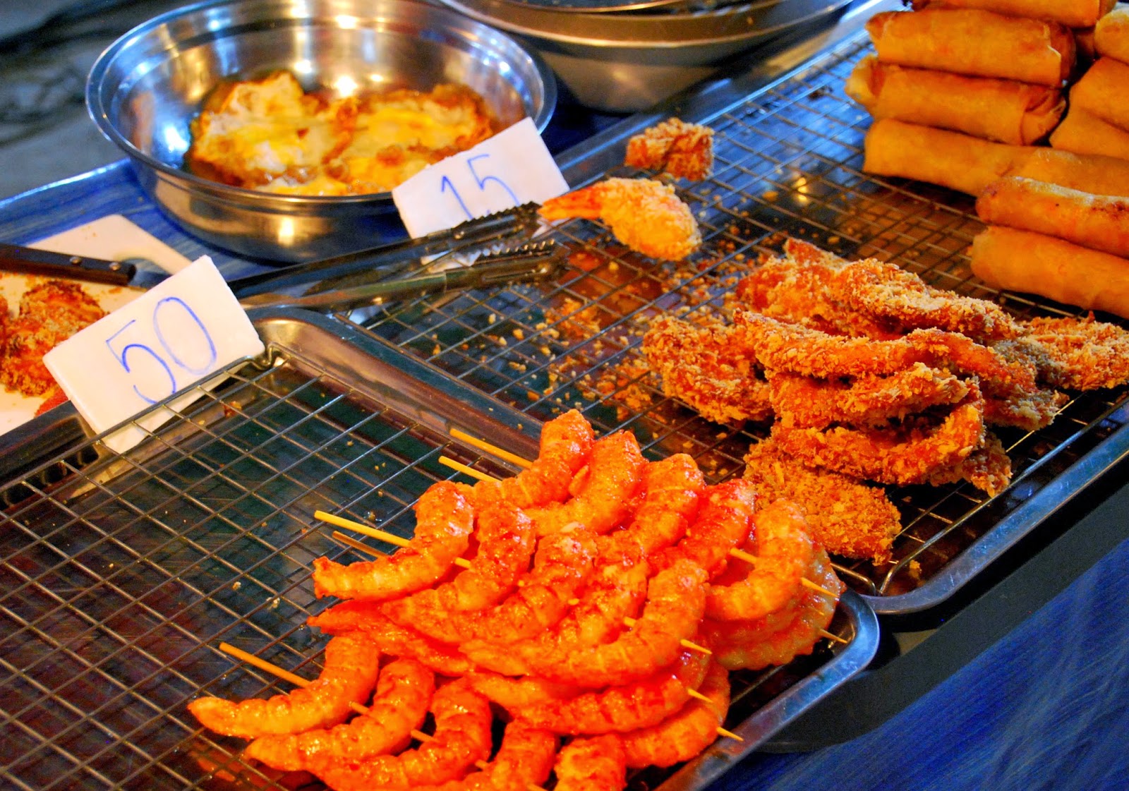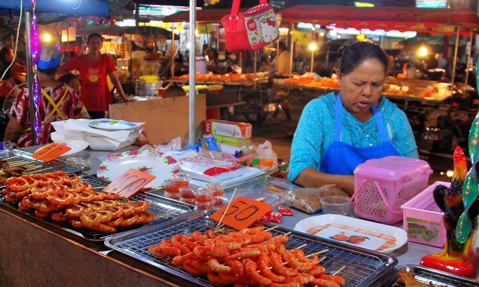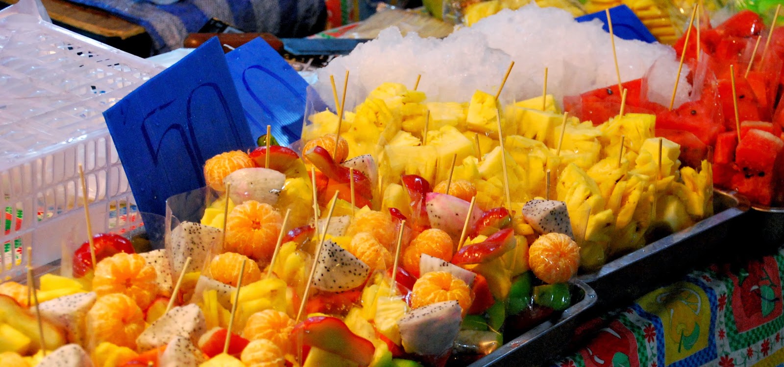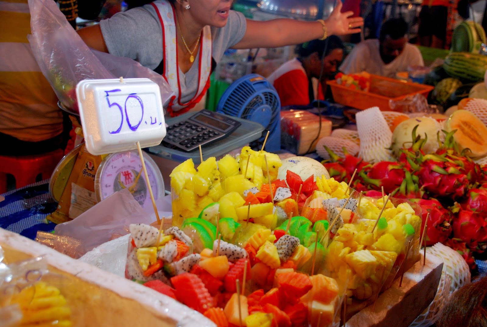 Auf den Märkten tummeln sich Thais um das Essen für ihre Familien zu kaufen und etliche Urlauber. Grillspieße liegen aus, frisch gefangener Fisch liegt auf Eis, Früchte in allen Farben, Gewürze. Es gibt nichts, was es hier nicht gibt. Selbst einen Stand mit Sushi habe ich gesehen. Nachdem man sich für etwas entschieden hat, bekommt man es frisch zubereitet. Das Fleisch und der Fisch brutzeln auf dem Grill und werden anschließend nach Wunsch gewürzt. Anschließend wird es verpackt und kann gut mitgenommen werden. Auch viele Sitzgelegenheiten laden zum Verweilen an und so probiert man sich von Stand zu Stand.