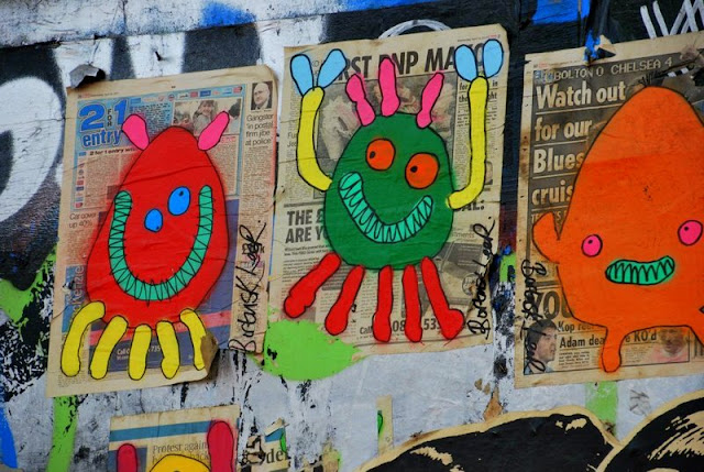 “art in public spaces — that is, “in the streets” — though the term usually refers to unsanctioned art, as opposed to government sponsored initiatives. The term can include traditional graffiti artwork, sculpture, stencil graffiti, sticker art, wheatpasting and street poster art, video projection, art intervention, guerrilla art, and street installations. Typically, the term street art or the more specific post-graffiti is used to distinguish contemporary public-space artwork from territorial graffiti, vandalism, and corporate art.