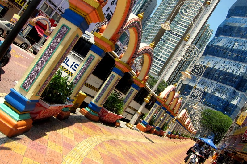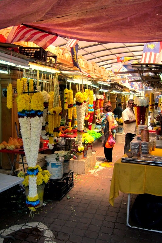 Wieder eine ganz neue Welt. Auch hier gewinnt man wieder total neue Eindrücke. Little India ist wie aus einem Bollywood Film entsprungen. Läuft man hier durch das Viertel hört man überall indische Musik, die aus den Läden kommt. Hier gibt es die schönsten, farbenprächtigen Stoffe, tollen Schmuck und kunstvolle Saris in den Schaufenstern zu bewundern. Little India ist nicht ganz so hektisch wie Chinatown und ich finde, auch sehr viel schöner. Die Straßen sind mit buntem Mosaik verziert und überall gibt es Springbrunnen und Statuen. An jeder Ecke gibt es Gebetsketten aus Blumen zu kaufen und es ist bemerkenswert, dass diese bei der Hitze bestehen können.