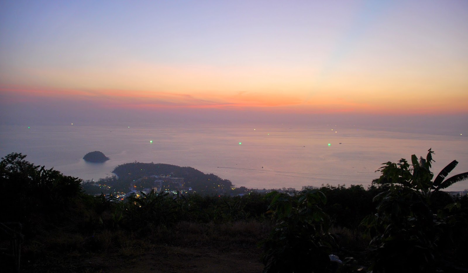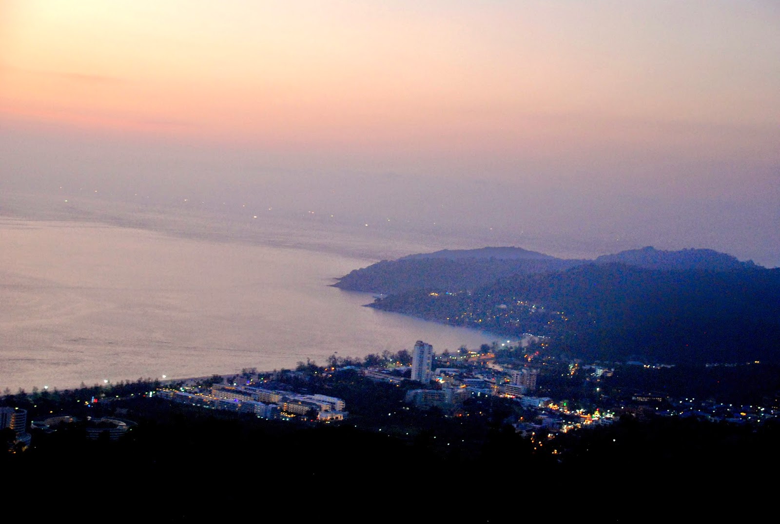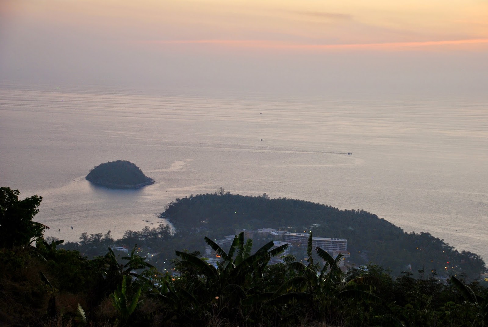 Die Sonne geht hier relativ früh unter, das wusste ich. Als ich auf mein Handy schaute, um mir das anzeigen zu lassen, war ich überrascht. Ich hatte nur noch 20 Minuten und ich war doch noch ein ganzes Stück entfernt. Schnell packte ich meine Sachen zusammen und eilte zu meinem Mofa. Der Weg zum Nakkerd Hill hinauf ist kurvig, steil und es befinden sich sehr viele „Speed bumps“ auf dem Weg. Man muss sehr vorsichtig fahren, da ich aber in Eile war, hielt ich mich nicht ganz daran. Ich beschleunigte, bremste kurz vor einer Bodenschwelle hab, um danach direkt wieder zu beschleunigen. Die Sonne war schon sehr tief, aber ich wollte es unbedingt rechtzeitig schaffen. Oben an der Big Buddha Staute angekommen, stellte ich mein Mofa ab und eilte zur Aussichtsplattform, um dann festzustellen, dass diese vollkommen leer war. Den Sonnenuntergang konnte man nur von der anderen Seite betrachten, also schnell wieder zurück zum Mofa und auf der Landstraße den Berg etwas herunter. Ich stellte mein Mofa ab und fotografierte durch Gebüsch und Bäume, wie die Sonne langsam im Meer versank, Ich hatte es noch rechtzeitig geschafft. Was für ein Nervenkitzel. Nachdem ich meine Fotos gemacht hatte, fuhr ich noch ein bisschen weiter. Auf der Strecke sind mehrere sehr einfache Bars und Restaurants, von denen man den Sonnenuntergang sehr gut sehen kann. Bei der ersten Bar, die ich sah, hielt ich an. Von hier oben hat man einen wundervollen Ausblick über die Chalong Bucht und Karon. Der Himmel färbte sich in den tollsten Farben und man sah, wie die Lichter im Tal langsam angehen. Auch auf See gehen die Lichter der Boote an.