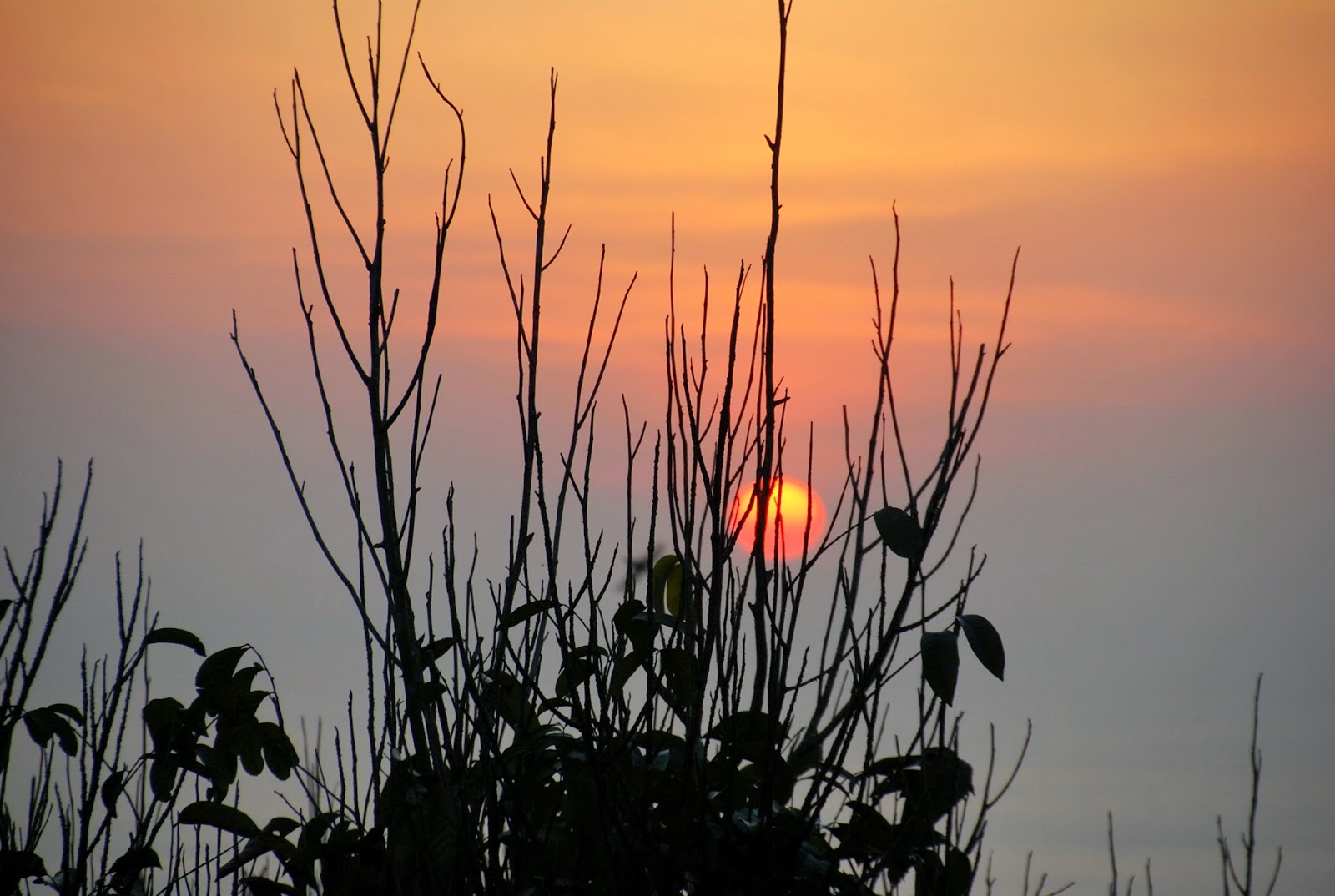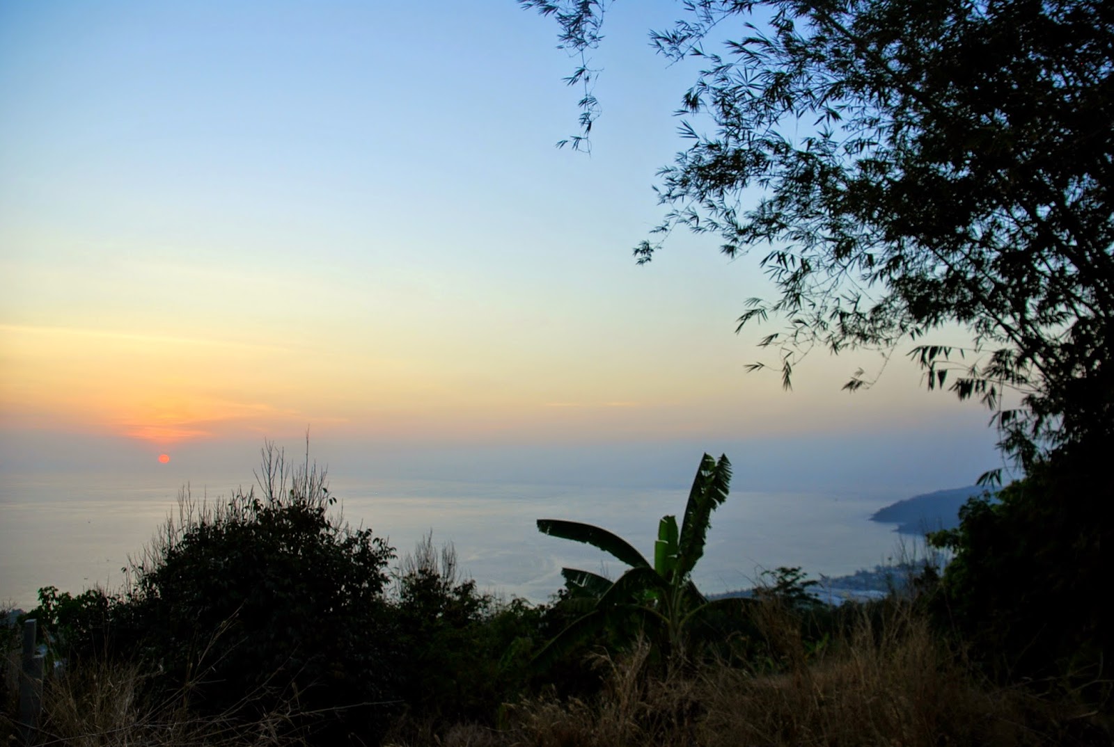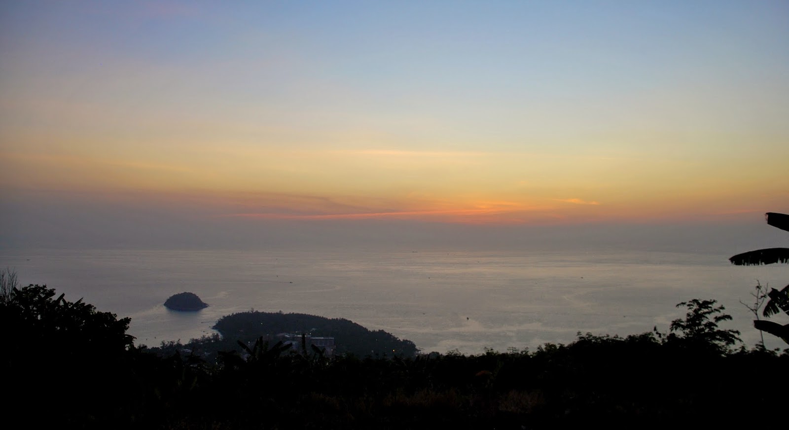 Die Sonne geht hier relativ früh unter, das wusste ich. Als ich auf mein Handy schaute, um mir das anzeigen zu lassen, war ich überrascht. Ich hatte nur noch 20 Minuten und ich war doch noch ein ganzes Stück entfernt. Schnell packte ich meine Sachen zusammen und eilte zu meinem Mofa. Der Weg zum Nakkerd Hill hinauf ist kurvig, steil und es befinden sich sehr viele „Speed bumps“ auf dem Weg. Man muss sehr vorsichtig fahren, da ich aber in Eile war, hielt ich mich nicht ganz daran. Ich beschleunigte, bremste kurz vor einer Bodenschwelle hab, um danach direkt wieder zu beschleunigen. Die Sonne war schon sehr tief, aber ich wollte es unbedingt rechtzeitig schaffen. Oben an der Big Buddha Staute angekommen, stellte ich mein Mofa ab und eilte zur Aussichtsplattform, um dann festzustellen, dass diese vollkommen leer war. Den Sonnenuntergang konnte man nur von der anderen Seite betrachten, also schnell wieder zurück zum Mofa und auf der Landstraße den Berg etwas herunter. Ich stellte mein Mofa ab und fotografierte durch Gebüsch und Bäume, wie die Sonne langsam im Meer versank, Ich hatte es noch rechtzeitig geschafft. Was für ein Nervenkitzel. Nachdem ich meine Fotos gemacht hatte, fuhr ich noch ein bisschen weiter. Auf der Strecke sind mehrere sehr einfache Bars und Restaurants, von denen man den Sonnenuntergang sehr gut sehen kann. Bei der ersten Bar, die ich sah, hielt ich an. Von hier oben hat man einen wundervollen Ausblick über die Chalong Bucht und Karon. Der Himmel färbte sich in den tollsten Farben und man sah, wie die Lichter im Tal langsam angehen. Auch auf See gehen die Lichter der Boote an.