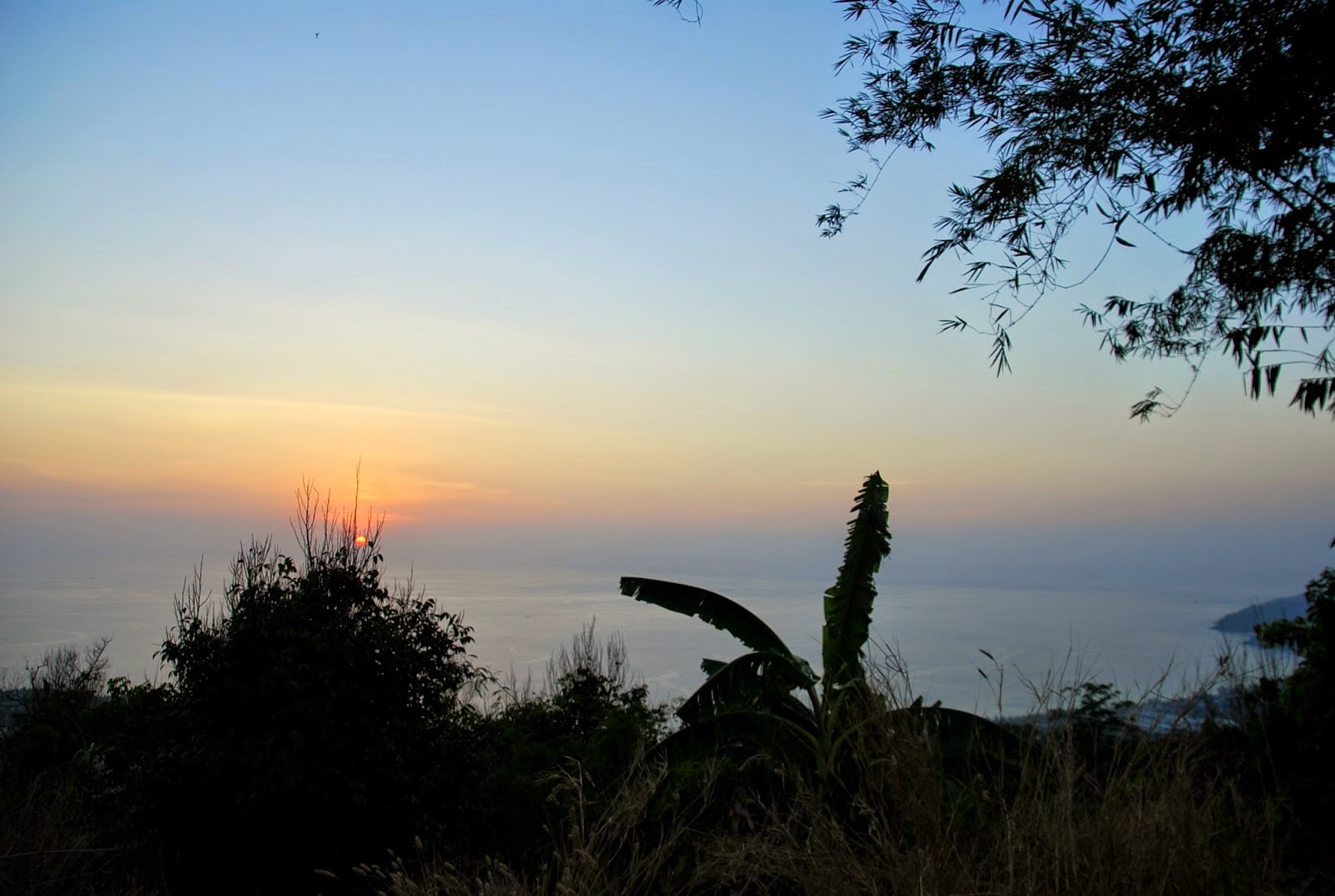 I knew that the sun sets relatively early here. When I checked my phone for the actual time, I got a little shock. I had only 20 minutes left and I was quite far away. Quickly I packed my things and rushed to my scooter. The road up to the Nakkerd hill is very curvy and steep and there are a few speed bumps on the way. You have to drive very carefully, but since I was in a rush, I was driving a bit irresponsible. I was driving fast and started to slow down just a bit before the speed bumps and after I had driven past them, I started to go faster again. The sun was already very low, but I really wanted to make it. Once I reached the Big Buddha statue, I parked my scooter and rushed to the viewing platform, just to discover that it was completely empty because you can only see the sunset from the other side of the hill. So I was rushing back to my scooter and drove down the country road a bit. I stopped at the first given opportunity where I could get some good pictures. I photographed through trees and bushes and got the chance to capture how the sun slowly started to sink and disappeared in the Amandan Sea. I made it in time and the thrill I had before was all worth for that view. After I got my picture I drove a bit further down the road. On the way there are many, really simple restaurants and bars, from where you can watch the sunset, while you enjoy a drink or a meal. I stopped at the first bar, I saw on the way. From up here you have a beautiful view of the Chalong Bay and Karon. The sky is colored in red, pink, yellow and blue and it is a magical moment to watch the houses get lid up in the valley below. You can also see the lights from the boats far out in the sea.