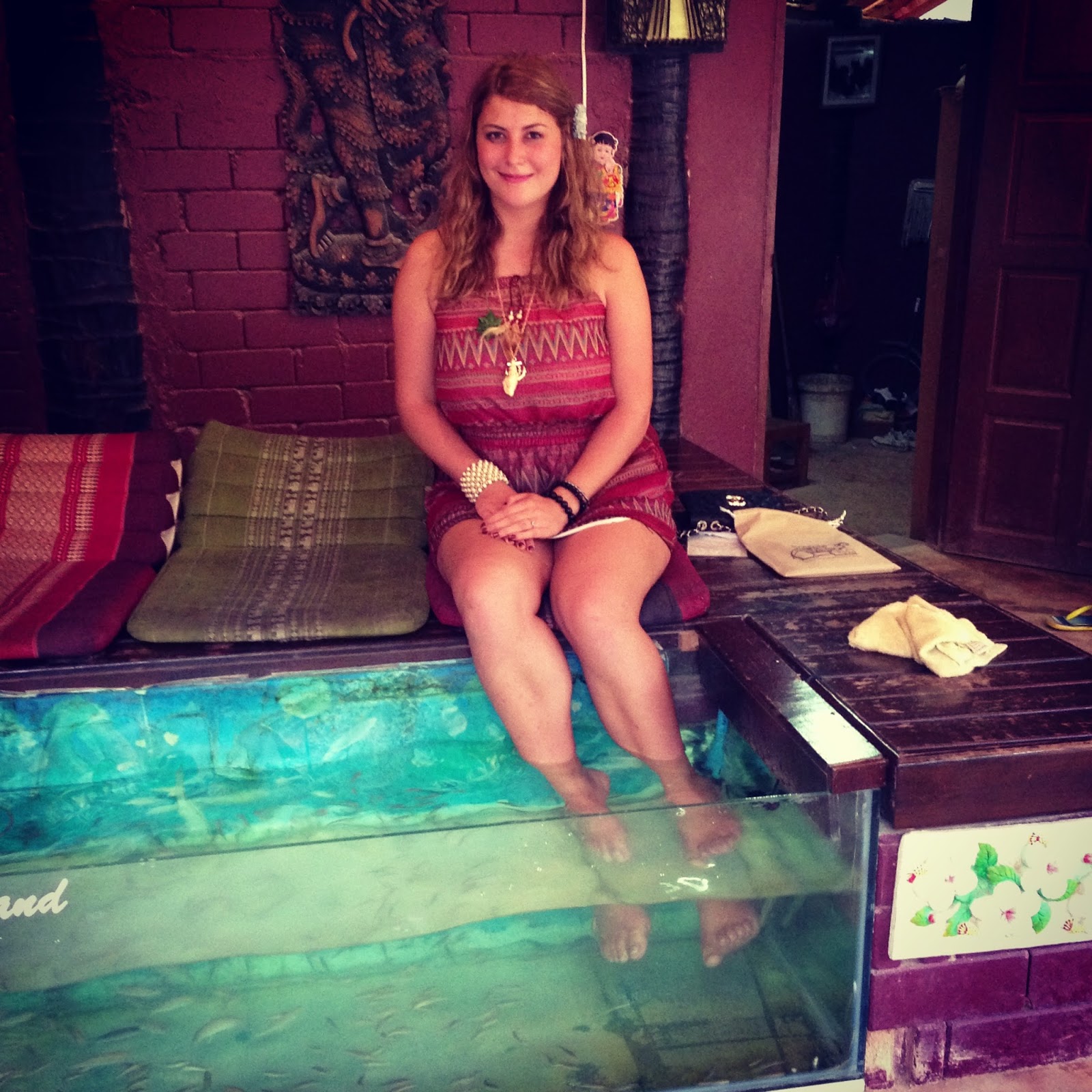 Fish spa. Fish are nibbeling your dead skin off your feet. I am definately to ticklish.