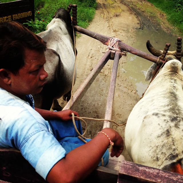 The buffalo is enjoying the cold water. Later he is going to help with the rice farming.